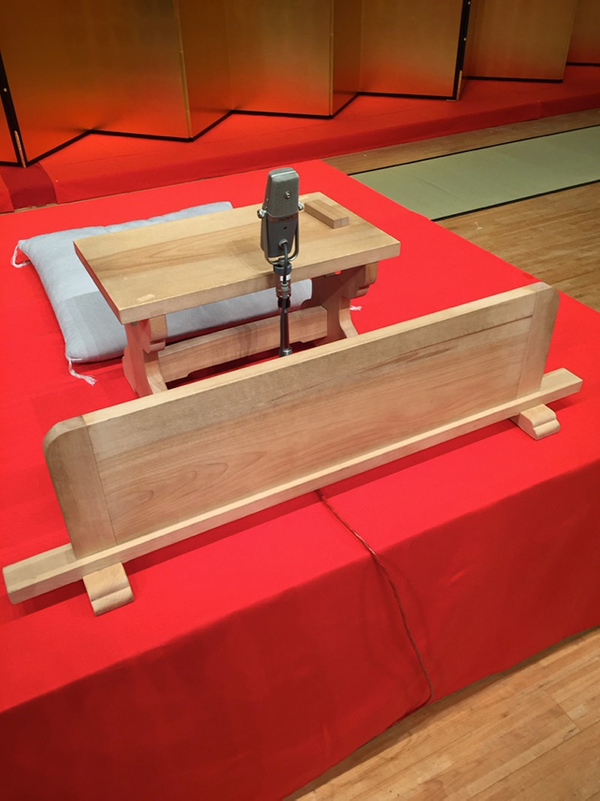 Le Kamigata rakugo se pratiquait donc, contrairement au Edo rakugo, en extérieur. Pour éviter de salir son éventail et son tenugui en les mettant par terre, les conteurs les posaient pendant qu’ils parlaient sur une table basse, le kendai.